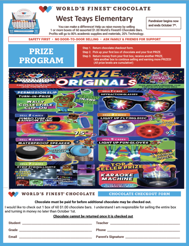 We are kicking off our school fundraiser with the sale of the World's Finest Chocolate Bars! It begins today and ends on October 7. If you are willing to participate, please return the permission slip that is coming home today, September 15th, with your child. There is also a PDF copy on Schoolgy.com you can download and print. We have not done a school fundraiser in a couple of years so we are hoping this will be successful. Thank you for all you do to help support the school!
